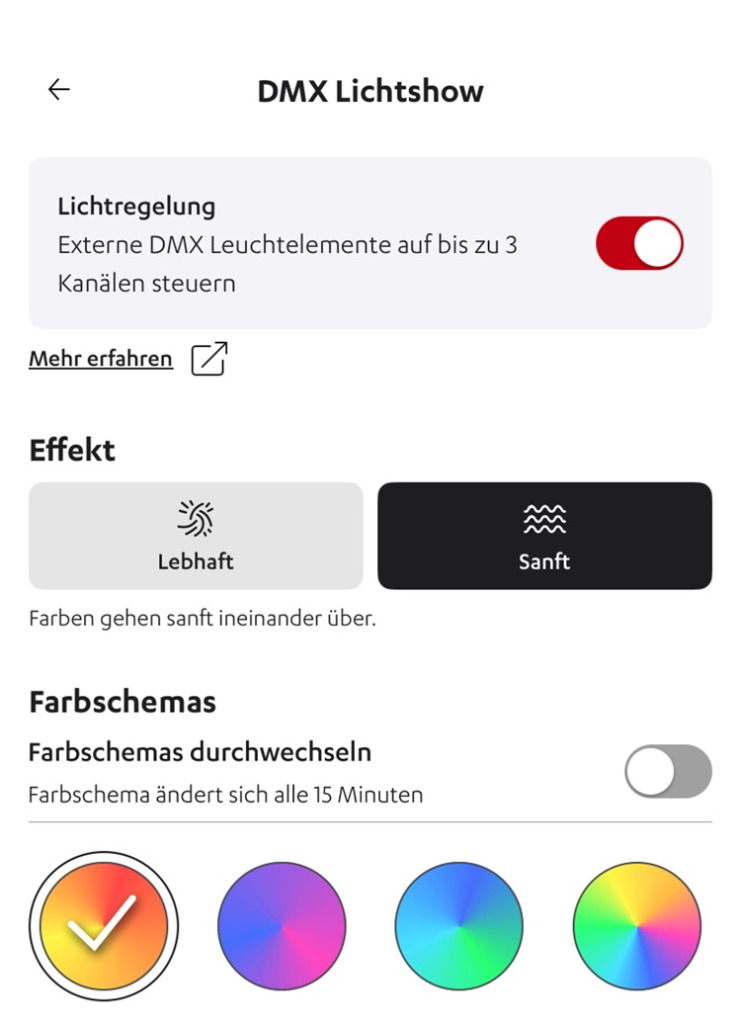 Das Coole daran: DMX, eigentlich ein klassischer Bühnenstandard, wird hier auf Intuition und Spaß heruntergebrochen. Statt mit Zahlen, Kanälen oder Programmen zu hantieren, steuerst du die Lichtstimmung direkt über klare Presets und simple Optionen. In der App legst du fest: